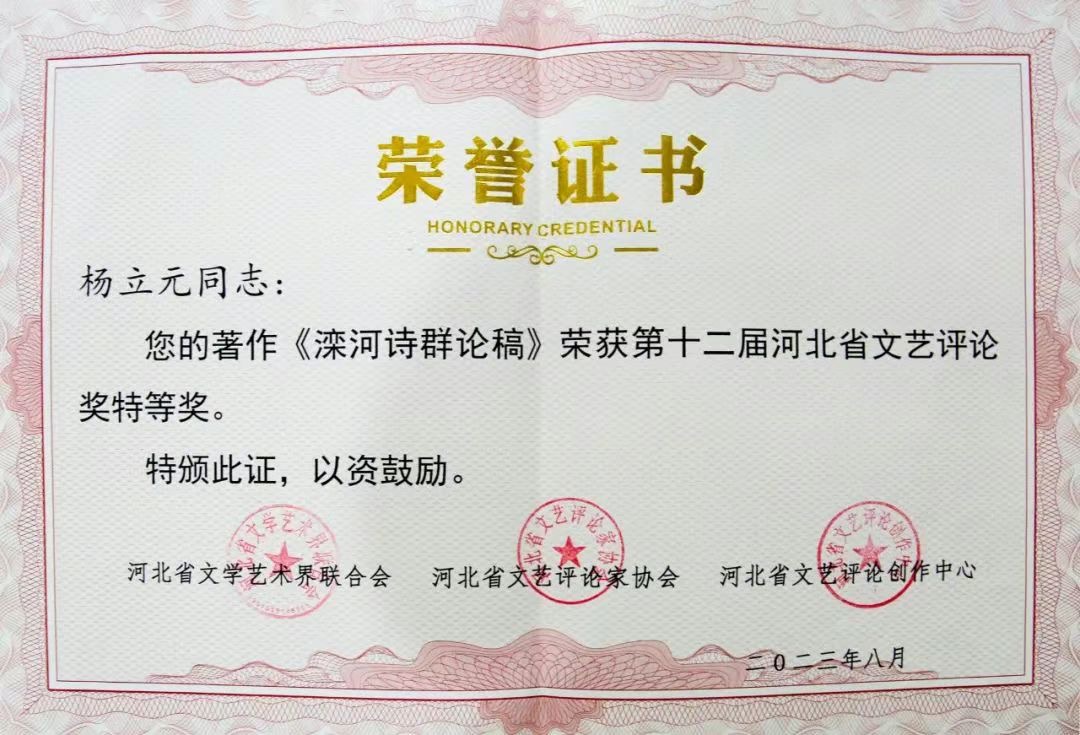 楊立元教授評論專著《灤河詩群論稿》獲第十四屆河北省文藝振興獎(jiǎng)