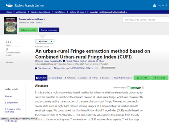 近日,我校資源管理系地理信息科學專業2021級本科生段紅銳作為第一作者,張雅靜為第三作者在地理信息與遙感領域知名SCI期刊《Geocarto International》(JCR分區Q2,中科院分區4區,IF為3.8)上發表了題為《An urban-rural fringe extraction method based on Combined Urban-rural Fringe Index(CUFI)》的學術論文。