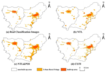 該論文針對城鄉發展過程中城鄉結合部邊界難以提取的問題,對傳統提取方法進行了改進,提出了一種基于夜間燈光遙感影像、POI數據及Landsat8 L2級遙感影像等多源數據的城市建成區邊界提取方法。相比于傳統方法,該論文提出的方法具有更高的信息提取精度,既能夠有效剔除城區中的城中村和湖泊信息,也能對夜間燈光影像和POI數據在城鄉結合部提取的分辨率進行提升,可以有效的對城中村及夜間燈光較弱、POI點較少,但實際具有城鄉二元屬性的城鄉結合部進行識別,解決以往數據源相對單一、城市城鄉結合部劃分不夠精確的問題,實現了對城鄉結合部范圍更為準確的信息提取。