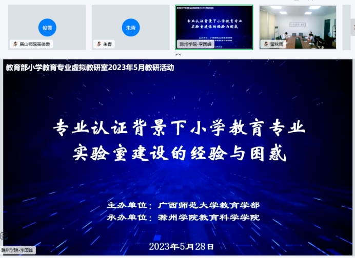 本次教研活動由廣西師范大學教育學部主辦,滁州學院教育科學學院承辦,采取線上會議形式,研討主題為“專業認證背景下小學教育專業實驗室建設的經驗與困惑”。