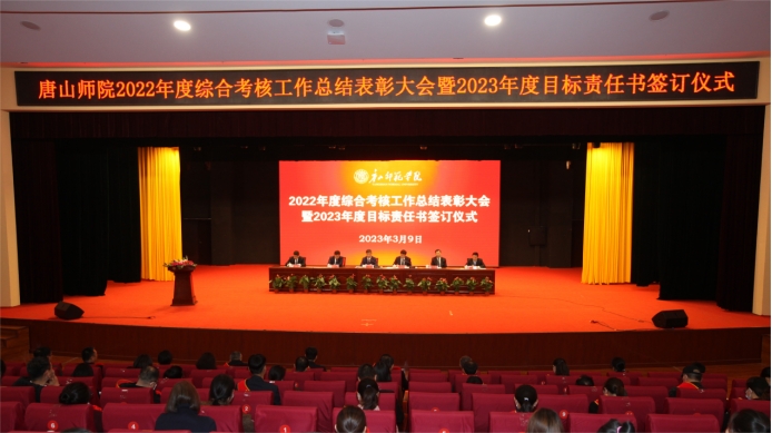 會上,楊濤宣讀了《中共唐山師范學院委員會 唐山師范學院關于表彰2022年度綜合考核優秀單位、優秀個人的決定》,評選出“2022年度考核優秀單位”榮譽稱號14個,授予郭文利等22名同志“2022年度考核優秀記功個人”榮譽稱號,徐鐵紅等31名中層干部、劉繼祥等6名鄉村振興干部、馬振等108名科級及以下干部“2022年度考核優秀個人”榮譽稱號。師院領導為優秀單位和個人代表頒發了證書和獎牌。組織部、教務處、歷史文化與法學系、化學系、圖書館、國際交流中心在會上進行了交流發言。二級單位代表與孫政院長簽訂了2023年度目標責任書。