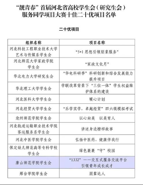 為深入學習貫徹黨的二十大精神,深化學生會組織“我為同學做實事”活動成果,引導高校學生會(研究生會)回歸服務本位,河北省學生聯合會組織開展了“靚青春”首屆河北省高校學生會(研究生會)服務同學項目大賽。經省學聯秘書處集中評審、組織答辯等環節,唐山師范學院學生會《“1332”——交互式服務交流平臺 引領青年成長成才》從全省192個項目中脫穎而出,項目獲評河北省“二十優項目”。