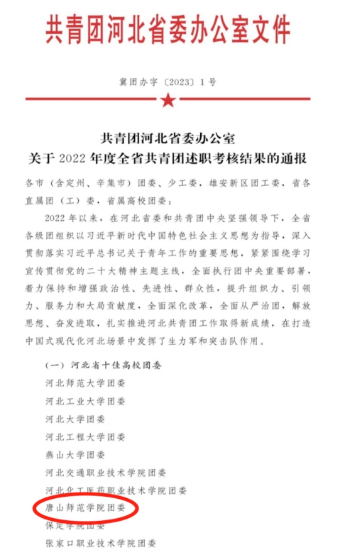 近日,共青團(tuán)河北省委公布2022年度全省共青團(tuán)述職考核結(jié)果,唐山師范學(xué)院團(tuán)委獲評(píng)2022年度“河北省十佳高校團(tuán)委”,師院團(tuán)委已連續(xù)四年獲此殊榮。