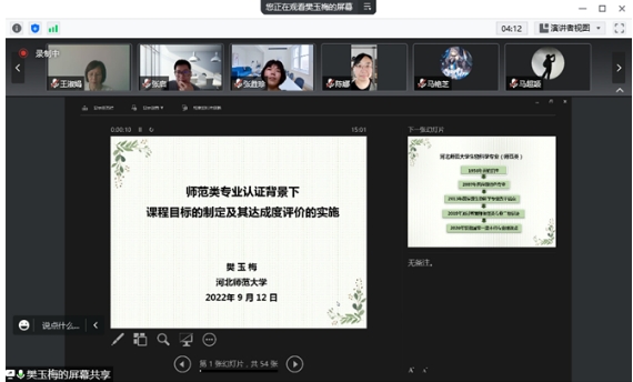 為進一步鞏固和提高師范專業認證成果,深刻把握“學生中心、產出導向、持續改進”的理念,持續提高師范類專業人才培養質量,2022年9月12日,師院邀請河北師范大學生命科學學院國家一流本科專業負責人、國家本科一流課程負責人樊玉梅教授作專業認證線上講座,生命科學系全體教師、師范類專業相關院系教師、教務處相關人員93人參加了線上講座與交流。