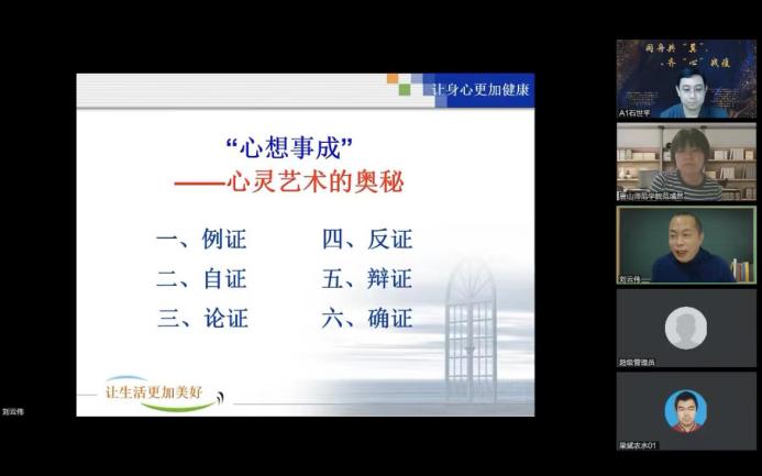 2022年5月9日晚,心理健康節(jié)系列講座第五講“心想事成--心靈藝術(shù)的奧秘”通過騰訊會議如期與同學們線上相見,本次講座由師院體育系劉云偉老師主講,來自河北各高校一千多名師生線上觀看。