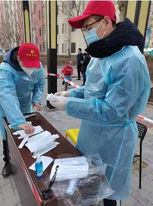 疫情來襲,危難當前,體育系教師黨支部書記石永秀挺身而出,第一時間到社區報備,參加社區疫情防控服務。石永秀老師每天早晨七點半準時報到,領取防護物品并穿戴整齊,八點進行入戶核酸檢測,社區內的核酸檢測工作結束后,他馬上轉到社區外圍光明路至友誼路之間新華道南側的寶島婦產醫院、興業銀行、張家口銀行、中國聯通、七天酒店、牙博士、恒輝公司、唐人街等企業,對所有商戶進行核酸檢測,直到下午五點左右才能完成,一天連續工作六至八小時,忙起來中午飯經常顧不上吃。