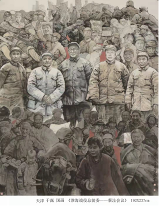 作品以淮海戰役蔡洼會議為主題,蔡洼會議是關系到黨和國家前途命運的決定性會議,在中國革命史、軍史上具有重要地位。據作者于露老師介紹,他的爺爺于叢云老先生生前作為解放軍參加了淮海戰役,所在連隊參加并逮捕了國民黨淮海戰役徐州“剿總”副總司令杜聿明,并在戰爭中榮獲三等功,作品中也多次以此為素材進行描繪。
