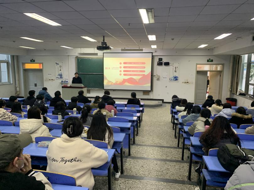 2021年12月3日,唐山師范學院副院長李子林以“全面解讀十九屆六中全會”為題,于北院文科樓第一階梯教室開展十九屆六中全會主題宣講,歷史文化與法學系65名師生代表聆聽本次宣講,系主任沈芝、黨總支書記丁新龍、黨總支副書記楊玉娟等出席會議。