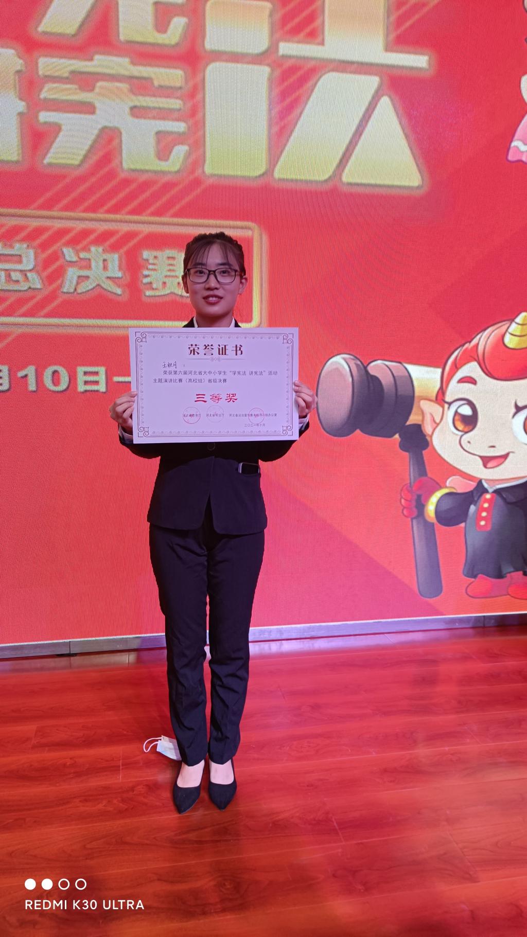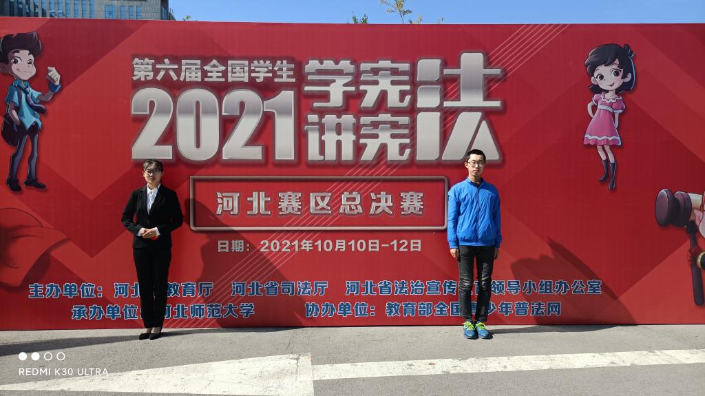 為進一步增強學生的憲法意識,大力弘揚憲法精神,2021年10月10日—12日,由河北省教育廳、河北省司法廳、河北省法治宣傳教育領導小組辦公室舉辦的第六屆河北省大中小學生“學憲法講憲法”大賽暨全國選拔賽在河北師范大學隆重召開。本次比賽分為憲法法治知識競賽和“學憲法講憲法”演講比賽兩個部分。我校選派的歷史文化與法學系2019級法學專業學生嚴晗在憲法法治知識競賽中榮獲“高校組省級決賽一等獎”。2020級法學專業學生王秋月在“學憲法講憲法”演講比賽中榮獲“高校組省級決賽三等獎”,指導教師王芳和王碧瑜分別獲得兩個比賽的“優秀指導教師”稱號。