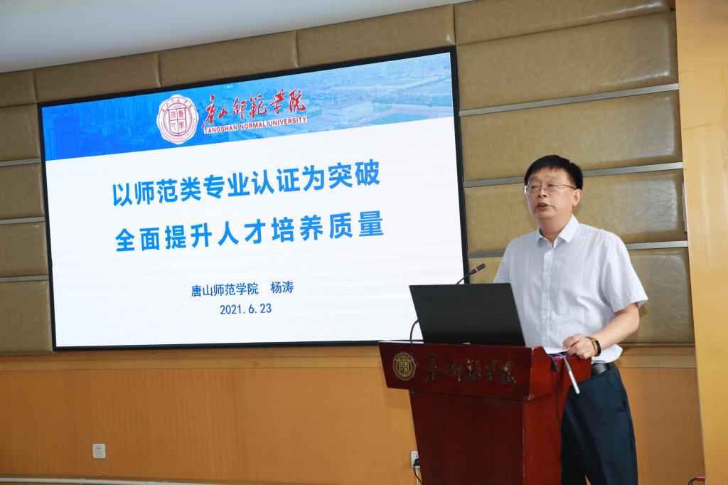 副校長楊濤從五個方面介紹了我校師范類專業辦學情況。第一,弘揚“兩種精神”,堅持紅色文化育人,厚植師范生教育情懷。學校堅持立德樹人根本任務,充分利用冀東地區紅色資源,在長期的辦學實踐中形成了“以抗震精神辦學,大釗精神育人”辦學理念,并把“兩種精神”貫穿落實到治校育人各個實踐環節中,形成了“知行合一,大愛及人”的校風,“良師益友,承緒出新”的教風,“沉下心思,放開眼界”的學風。第二,面向社會需求,對標認證標準,重塑人才培養體系。我校師范生素質和能力培養課程飽滿,通識教育、專業教育、教師教育、素質拓展教育課程均達到認證標準,構建了基礎實踐、教師技能實踐、綜合實踐三位一體,知識、能力、素質三個維度共同提升的實踐教學體系。第三,加大教學投入,優化支持條件,保障人才培養質量。我校始終堅持教學經費優先投入,保證教學經費穩步增長,為師范類專業本科教學需求提供了有力保障。第四,堅持學生中心,服務學生成才,構建“三全”育人體系。根據學生的職業發展規劃,全方位服務于學生的成長與成才。第五,樹立質量意識,加強質量監控,構建持續改進機制。堅持不斷完善教學質量標準和管理制度,通過制度約束和政策激勵,推動教風和學風建設,保證教學規范、有序開展。