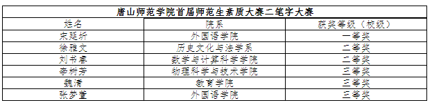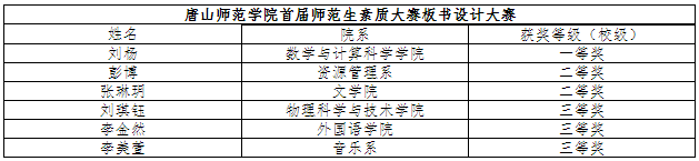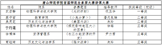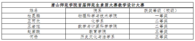 本次大賽我校邀請了河北省、唐山市兩級教學(xué)名師馮翠紅、王福會、裴愛玲、鄭有亭、王海峰、梁寧擔(dān)任復(fù)賽、決賽評委,在比賽結(jié)束后,評委代表河北省特級教師、河北省名師王福會老師做了點評,她指出,河北省內(nèi)好多教師名師、骨干教師都來自于我校,充分證明我校一直高質(zhì)量的培養(yǎng)在校師范生,為河北省的教育事業(yè)輸出了不少人才,做出了很大貢獻。參賽選手們在備課中探究有策略,記憶有方法,問題有預(yù)見,創(chuàng)新有鉆勁,講課中自信勇敢、落落大方、淡定從容。希望同學(xué)們以后以小組形式多練習(xí),練心理、練板書、練語言、練教學(xué)設(shè)計,切實提高自己的師范技能。
