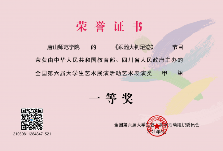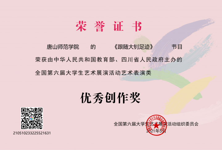 5月6日至5月13日,由中華人民共和國教育部、四川省人民政府聯合主辦的“全國第六屆大學生藝術展演活動”在成都順利舉行。我校在此次活動中表現優異,首次榮獲全國第六屆大學生藝術展演活動“優秀組織獎”,選送的原創朗誦作品《跟隨大釗足跡》榮獲全國第六屆大學生藝術展演活動藝術表演類甲組“一等獎”及“優秀創作獎”。