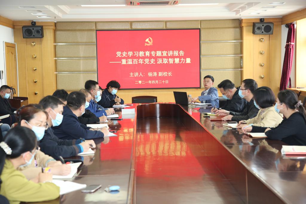 4月20日下午,在主樓五層會議室,副校長楊濤以“重溫百年黨史 汲取智慧力量”為主題進行黨史學(xué)習(xí)教育專題宣講。人事處、教務(wù)處、信息技術(shù)中心、現(xiàn)代教育技術(shù)中心、教科所、實驗管理中心6個行政教輔部門的全體同志參加了此次會議。