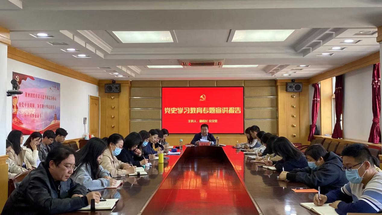 副校長安文忠從深入學習領會習近平總書記關于黨的歷史的重要論述,充分認識開展黨史學習教育的重大意義;認真研讀黨史基本著作;深刻把握開展黨史學習教育的重點;要學懂弄通做實習近平新時代中國特色社會主義思想,增強“四個意識”、堅定“四個自信”、做到“兩個維護”,四個方面詳細闡釋了如何開展黨史學習教育。