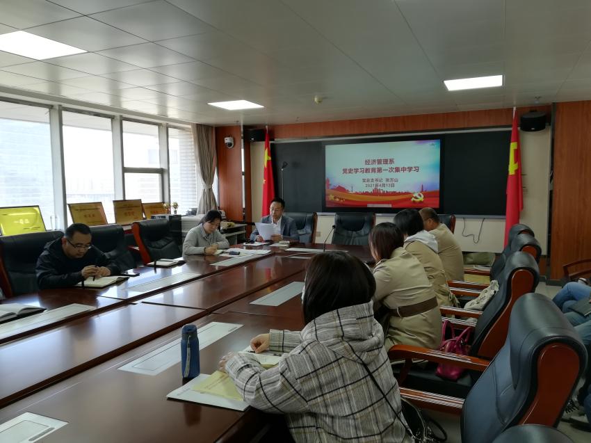 2021年4月13日下午三點,為貫徹落實學校黨委《關于開展黨史學習教育的通知》和《關于深化“兩種精神”育人實踐暨紀念中國共產黨建黨100周年系列活動方案》的文件精神,嚴格落實《經濟管理系黨史學習教育實施方案》,經濟管理系黨總支開展黨史學習教育第一次集中學習活動,經濟管理系班子成員和全體教師參加了學習。