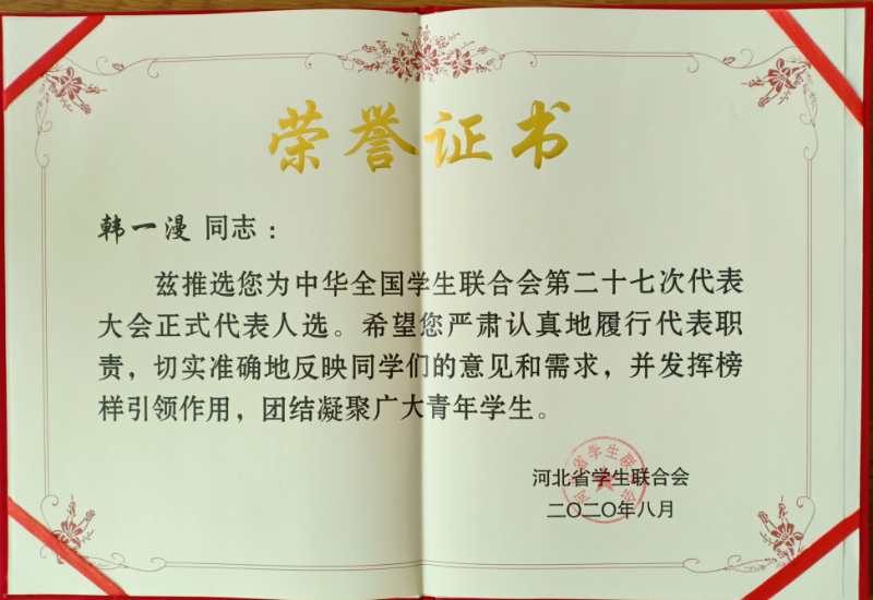 8月17日至18日,中華全國青年聯(lián)合會第十三屆委員會全體會議、中華全國學(xué)生聯(lián)合會第二十七次代表大會在北京順利召開。會議以電視電話會議形式舉行,各省、自治區(qū)、直轄市設(shè)分會場。我校物理科學(xué)與技術(shù)學(xué)院2018級教育技術(shù)學(xué)本科班韓一漫同學(xué)作為全國學(xué)聯(lián)第二十七次代表大會正式代表赴石家莊分會場參加會議。
