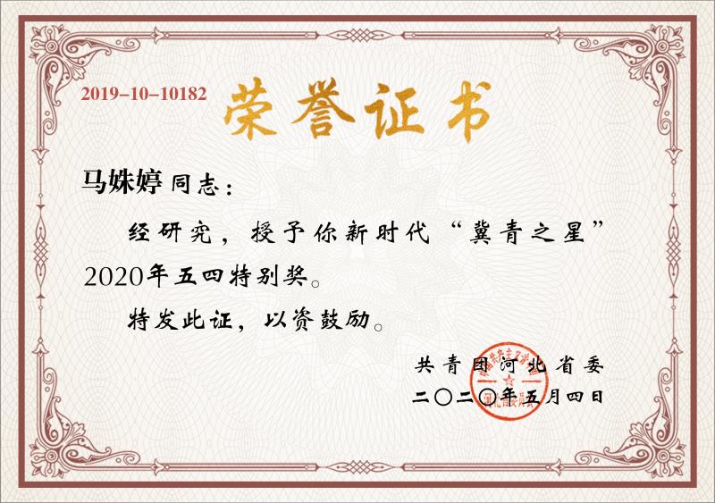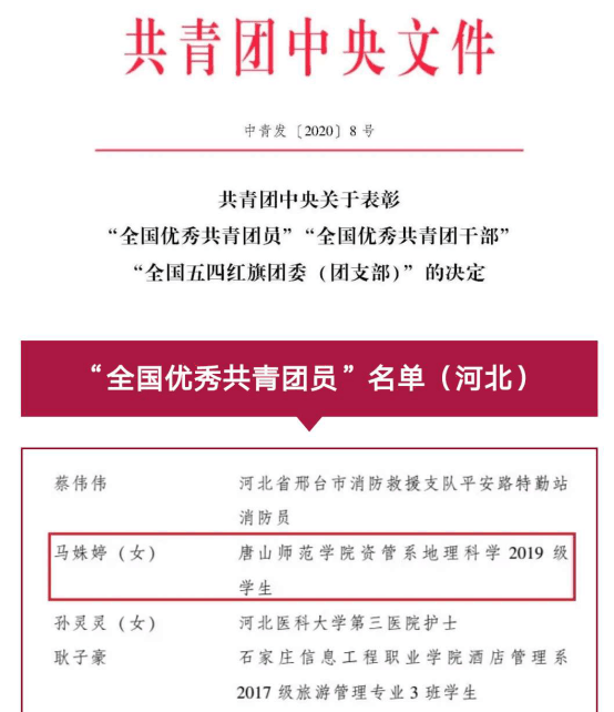 馬姝婷在高中期間就曾獲得“河北省省級優(yōu)秀共青團員”、“河北省省級三好學生”、“唐山市市級三好學生”等多個榮譽稱號,今年她還被團省委授予“新時代‘冀青之星’2020年五四特別獎”。作為“00后”大學生,她勇?lián)聲r代青年責任。新冠肺炎疫情爆發(fā)后,她第一時間投身社區(qū)疫情防控工作,并利用多種形式服務群眾,至今還服務在社區(qū)疫情防控工作崗位上。馬姝婷品學兼優(yōu)、吃苦耐勞、認真負責、樂于助人,為青年團員樹立了良好榜樣。
