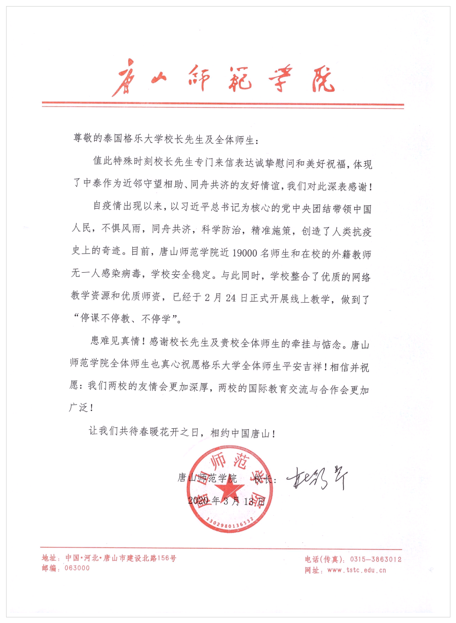格樂大學校長楊金泉博士(Dr. Krasae Chanawongse)在信中高度贊賞中國政府、中方醫務人員和每一位中國公民為抗擊疫情所做出的巨大努力。同時,對唐山師范學院全體師生致以誠摯的慰問,對學校全體師生在防控疫情上所作出的努力表示崇高的敬意。他堅信,在中國政府強有力的領導下,中國人民必將戰勝此次疫情。