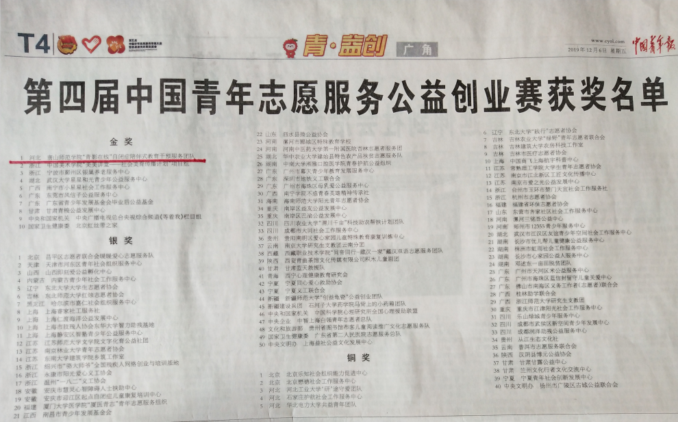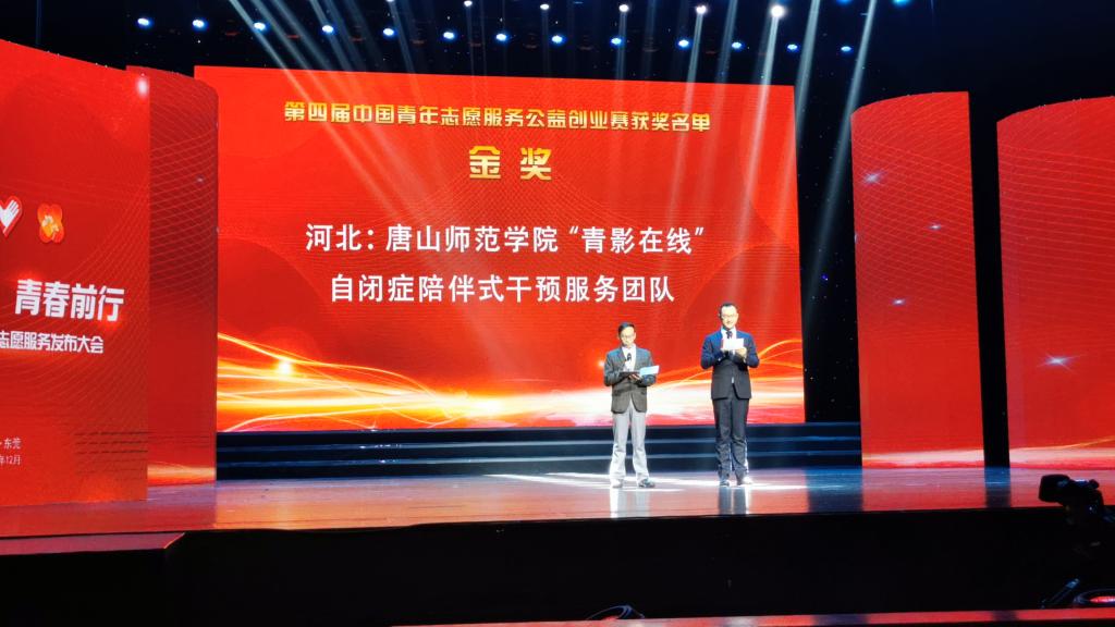 12月2日,由共青團(tuán)中央、中央文明辦、民政部、水利部、文化和旅游部、國家衛(wèi)健委、中國殘聯(lián)和中共廣東省委、廣東省人民政府共同舉辦的2019年志愿服務(wù)交流會暨第四屆中國青年志愿服務(wù)公益創(chuàng)業(yè)大賽在廣東東莞舉行。我校青年志愿服務(wù)品牌項(xiàng)目《“青影在線”——自閉癥陪伴式教育干預(yù)服務(wù)》經(jīng)過激烈的角逐,以全國總成績排名第一的成績榮獲國賽金獎,也是河北省唯一獲得金獎的參賽項(xiàng)目。新華社、中國青年報、中國青年雜志等媒體對大賽盛況及獲獎情況進(jìn)行報道。