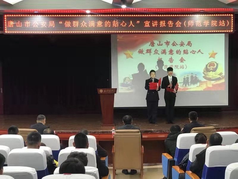2019年11月15日下午,唐山市公安局“不忘初心,牢記使命,做群眾滿意的貼心人”巡回宣講團來我校做報告,校黨委副書記姜瑞林、唐山市公安局政治部、高新分局相關領導、民警代表、我校師生代表以及群眾代表三百余人參加了報告會。十位基層民警代表結合工作實際,為大家做了生動的報告。