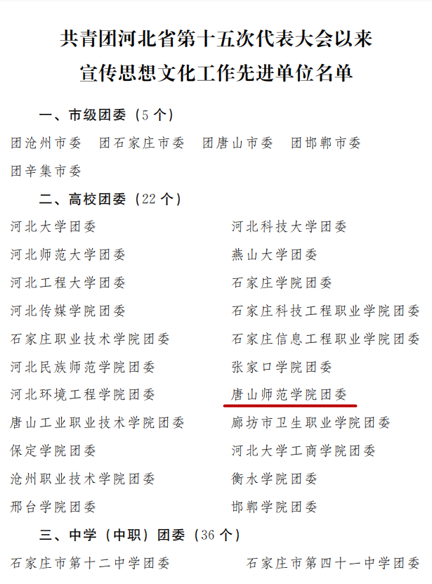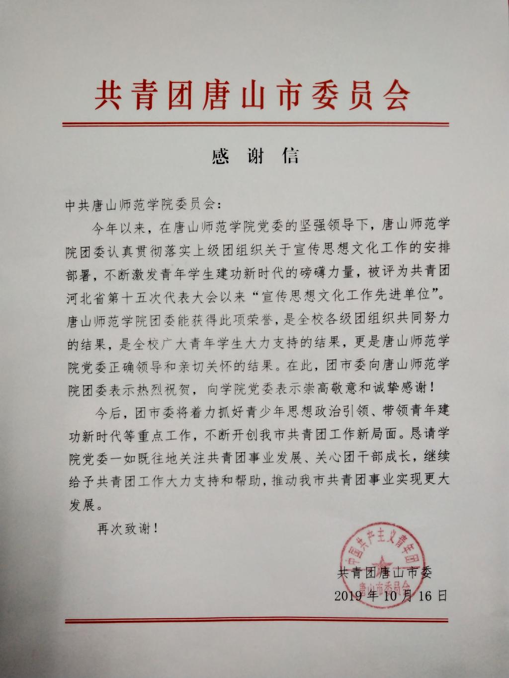 我校團委榮獲河北省共青團“團省十五大以來宣傳思想文化工作先進單位”稱號,共青團唐山市委向學校發來了感謝信。