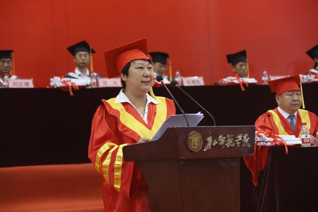 畢業生代表和教師代表相繼發言。化學系本科畢業生侯天文,代表全體畢業生向辛勤培育他們的領導和老師表達了崇高的敬意,表示要牢記校訓,努力為母校爭光。隨后,數學與信息科學系王朝霞教授,代表全體教師向順利完成大學學業的畢業生表示衷心祝賀,諄諄叮囑畢業生要懂得感恩,珍惜四年大學生活中的老師和同學;繼續扎實學習、踏實前進;完善人生規劃,創造美好未來。