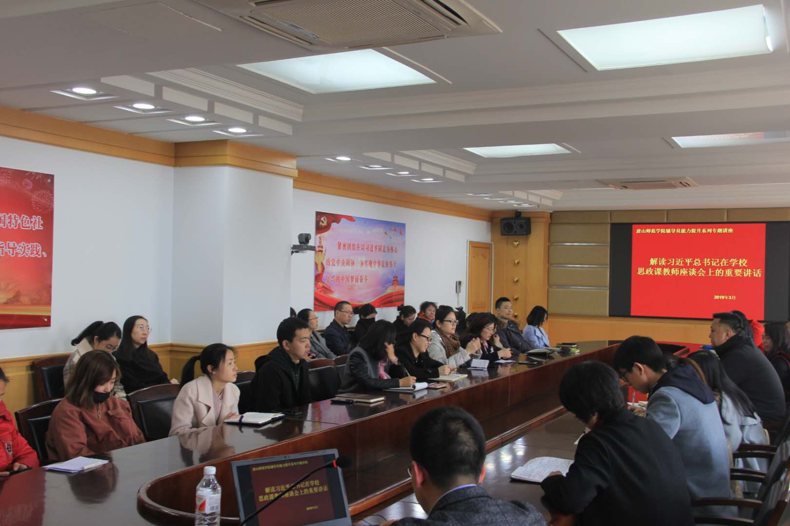 3月26日下午,學生處在我校五層會議室舉辦了“習近平總書記在學校思政課教師座談會上重要講話精神解讀”專題講座。本次培訓聘請我校社會科學部宋曉敏老師主講,講座由學生處副處長蔡玉梅主持,全體輔導員、黨總支副書記參加了培訓。