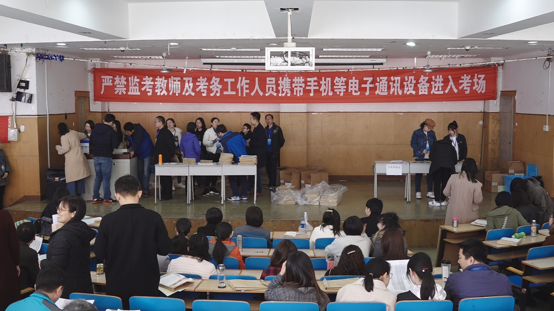 招生就業處從本學期開學初就開始積極籌備,周密把控考點工作的各個環節。從考務用品的準備到標準化考場的布置,從監考教師的遴選到考務工作人員的培訓,從考區周圍警示性標語的宣傳到考場內外防作弊設施的安放,從保密室監控到試卷跟蹤管理,從考試實時指揮到考場偶發事件的綜合處置,嚴把考務規范、安全保密、違紀處理等各環節,保證考試工作有序進行。辦公室、學生處、財務處、教務處、后勤規劃處、安全工作處、團委、現代教育技術中心等相關職能處室通力協作,全方位做好本次考試的各項保障工作。各教學單位精心選派政治素質高、業務素質強的教師參加考務和監考工作,并專門召開各單位監考教師工作動員會,確保考務工作萬無一失。教育學院孫尚斌書記、數信系宗鵬主任等院系領導帶頭參加監考工作。
