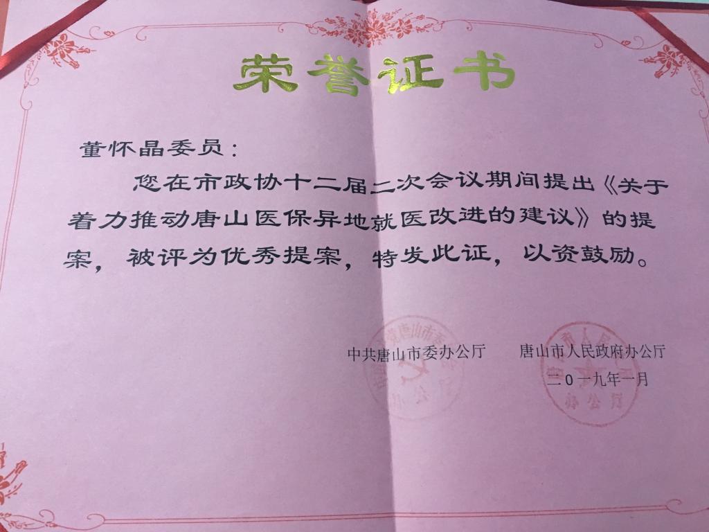 唐山市第十一屆和第十二屆政協委員、民進唐山師范學院二支部副主委、我校美術系學工辦主任董懷晶老師在唐山市政協十二屆二次會議期間提出的《關于著力推動唐山醫保異地就醫改進的建議》的提案,被唐山市委辦公廳、唐山市人民政府辦公廳評為優秀提案。