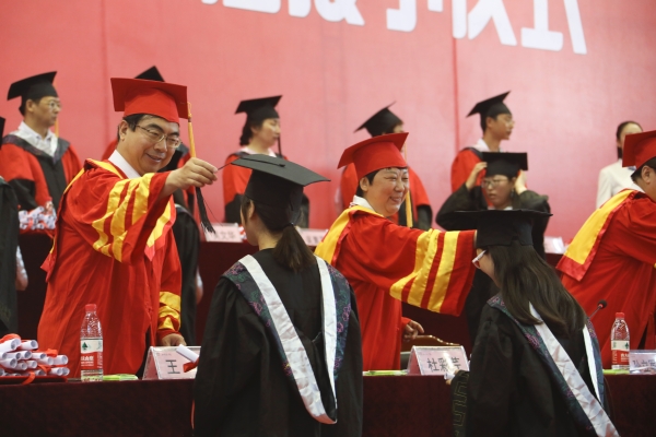 畢業典禮結束后,舉行了本科生學士學位授予儀式。校領導與校學術委員會的教授們為每位本科生正冠撥蘇、授予學位。