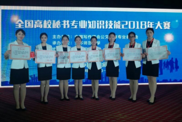 ,全國高校秘書專業(yè)知識技能2018年大賽落下帷幕。本次大賽由中國寫作學會公文寫作專業(yè)委員會主辦,江蘇師范大學承辦,江蘇省寫作協(xié)會協(xié)辦,共有來自全國45所高校的68支代表隊參加。經(jīng)過兩天的激烈角逐,我校中文系秘書學專業(yè)派出的兩支代表隊分別取得了團體特等獎和團體一等獎。2015級秘書學的付艷茹同學在272名參賽選手中脫穎而出,獲得
