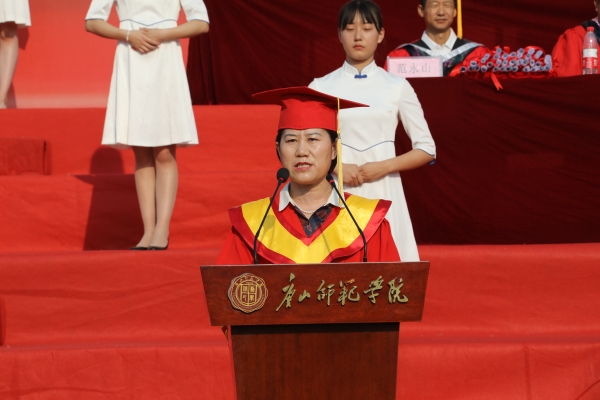 畢業生代表和教師代表相繼發言。中文系漢語言文學專業本科畢業生劉柳代表全體畢業生向辛勤培育他們的領導老師表達了崇高的敬意,表示要牢記校訓,努力為母校爭光隨后,生命科學系教師代表范永山代表全體教師向順利完成大學學業的畢業生表示衷心祝賀,諄諄叮囑畢業生要懂得感恩,珍惜四年大學生活中的老師和同學;繼續扎實學習、踏實前進完善人生規劃,創造美好未來。