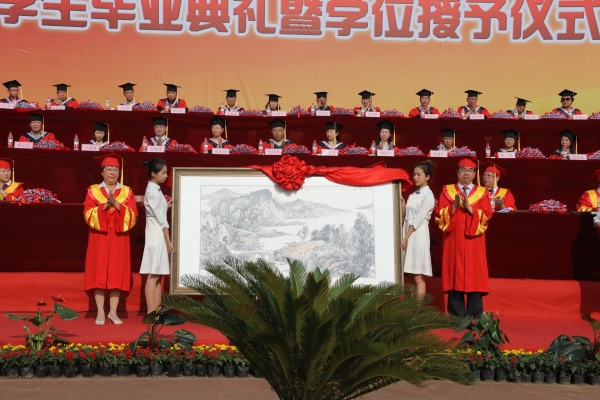最后,全體畢業生向母校贈紀念品——由美術系學生創作的畫作《丹秋碧樹》,以此來表達全體畢業生對學校的感激之情。王英書記和杜彩芹長代表學校接受了畢業生的珍貴禮物。