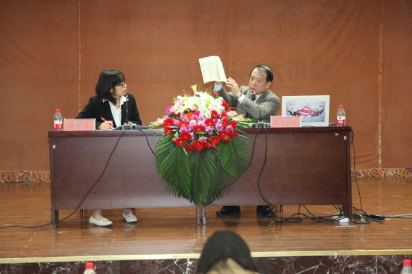 開幕式后,市澤靜山教授、魚住和晃教授分別就《張裕釗書法在日本書壇的地位》、《近代日本書法展現中的張裕釗》,結合珍貴的書法真跡和文獻資料,從歷史的角度分析評價張廉卿(裕釗)這一書法流派在日本的流派傳承、藝術風格、書法影響和歷史定位,分析論證了張裕釗書法在日本的深遠影響和偉大的藝術魅力。兩位日本書法家還現場回答了同學們關于日本大學中的書法教育和篆刻教育現狀等問題。會后,現場的中文系、美術系同學和日本來華教授一起近距離觀看了上條信山先生的多幅書法真跡。