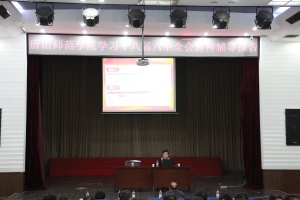 201612月5日下午,我校邀請唐山市委黨校理論研究室主任高民杰教授,在音樂報告廳舉辦了十八屆六中全會精神輔導報告會。黨委副書記趙劍鋒、黨委常委邊宏廣出席了報告會,全體中層干部、各黨支部書記、全體輔導員參加了報告會