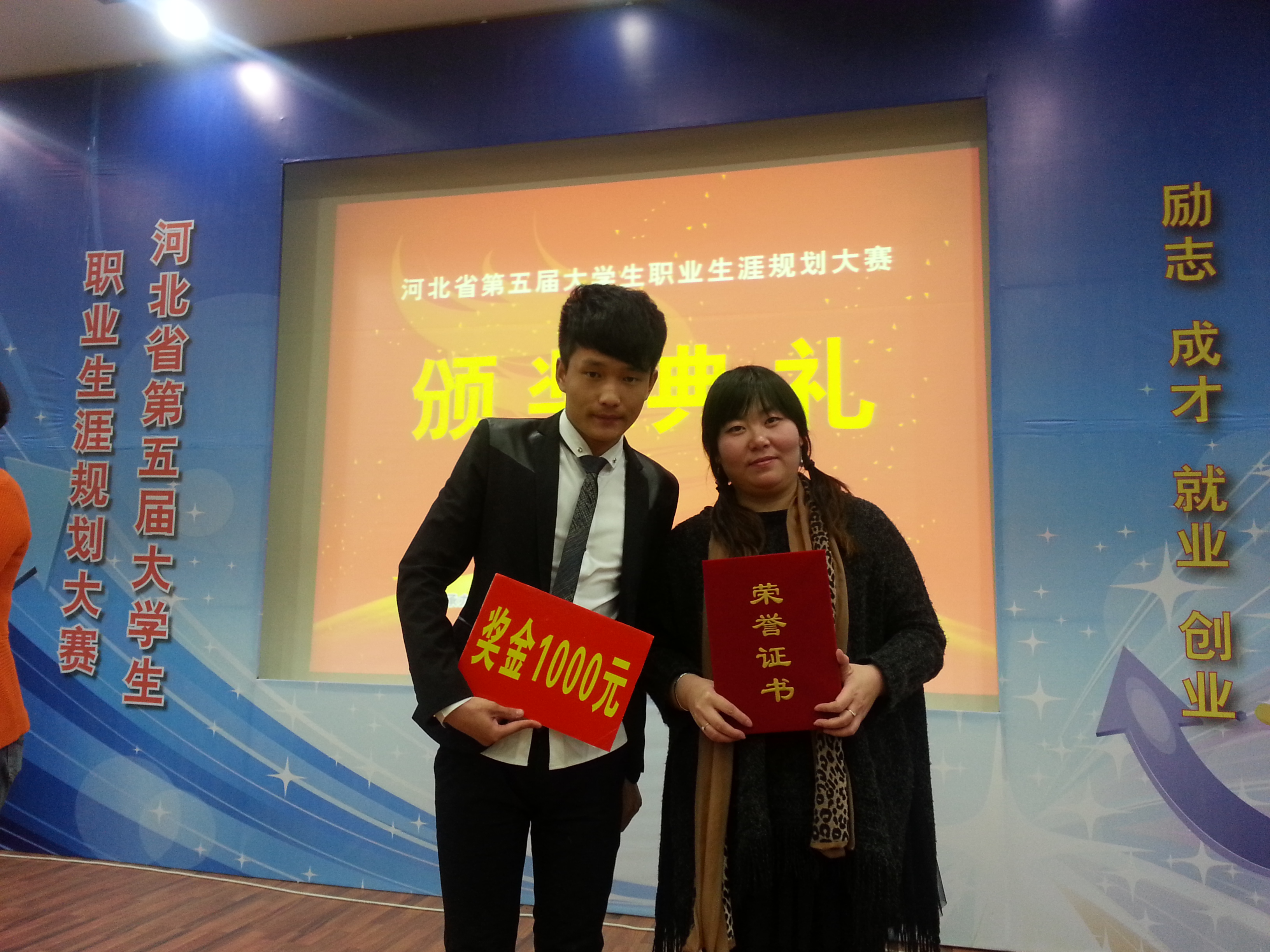 “河北省第五屆大學生職業生涯規劃大賽”總決賽于2014年3月20日~21日在華北電力大學保定校區舉行,受招就處委托,史法系張穎琳副書記帶隊參加了本次大賽。我校物理系12級應用物理學專業本科班學生高士杰晉級本科組總決賽,榮獲二等獎,教師陳靜、李雪梅獲優秀指導教師獎,同時我校榮獲優秀組織獎。