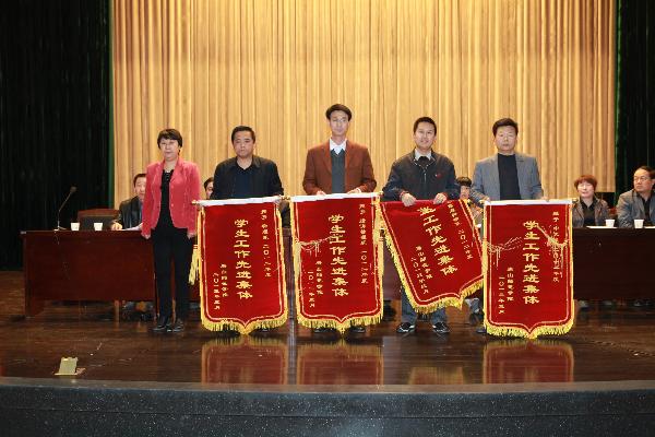 首先,由辦公室李繼林主任宣讀了“唐山師范學院關于表彰2012年度學生工作先進集體、先進班集體、先進工作者、優秀輔導員、優秀班主任的決定”;杜彩芹副院長為獲得“2012年度的學生工作先進集體”的數學與信息科學系、中文系、經濟管理系、物理系頒發了錦旗;辦公室李繼林主任、宣傳部王淑潔副部長、組織部唐福齊副部長為獲得“2011—2012學年先進班集體”的2011級歷史本科班等38個班級頒發了證書;招生就業處郭文利處長為獲得“2012年度學生工作先進工作者”的姜德輝、馬學敏、劉金鈴、崔乃忠、張妍頒發了證書;教務處李小六副處長為獲得“2012年度優秀輔導員”的劉夢、李艷利、馬駿、劉穎、傅曉光、李旭、郭小松、李誠、陳靜頒發了證書;后勤處劉建宏處長、科研處郭海莉副處長、保衛處張民副處長為獲得“2012年度優秀班主任”的武煒等29名同志頒發了證書;。
