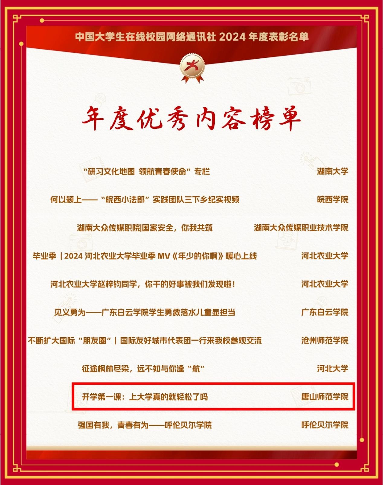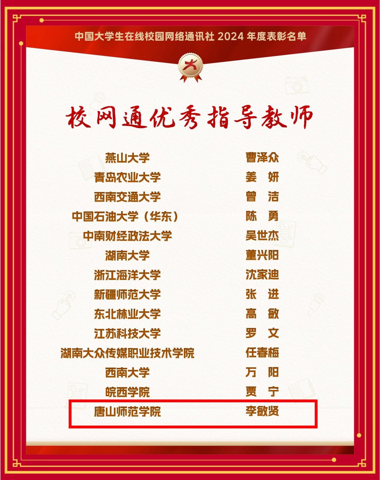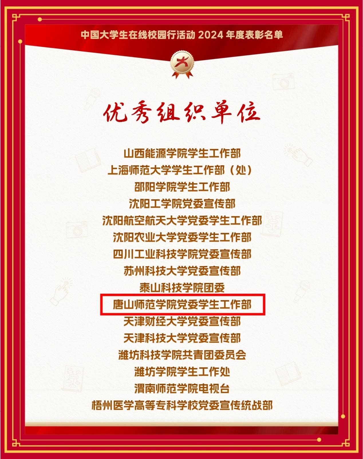 近日,教育部中國大學生在線公布了2024年度中國大學生在線校網(wǎng)通及校園行活動表彰名單,我校連獲6大獎項。其中,我校榮獲教育部中國大學生在線評選的“2024年度優(yōu)秀校網(wǎng)通站”稱號,黨委學生工作部榮獲“2024校園行優(yōu)秀組織單位”,學生處李敏賢老師榮獲“優(yōu)秀指導教師”“2024校園行新星指導教師”,文學院周瑤同學榮獲“優(yōu)秀學生編輯”,我校所發(fā)布推文《開學第一課:上大學真的就輕松了嗎》入選“年度優(yōu)秀內容榜單”。