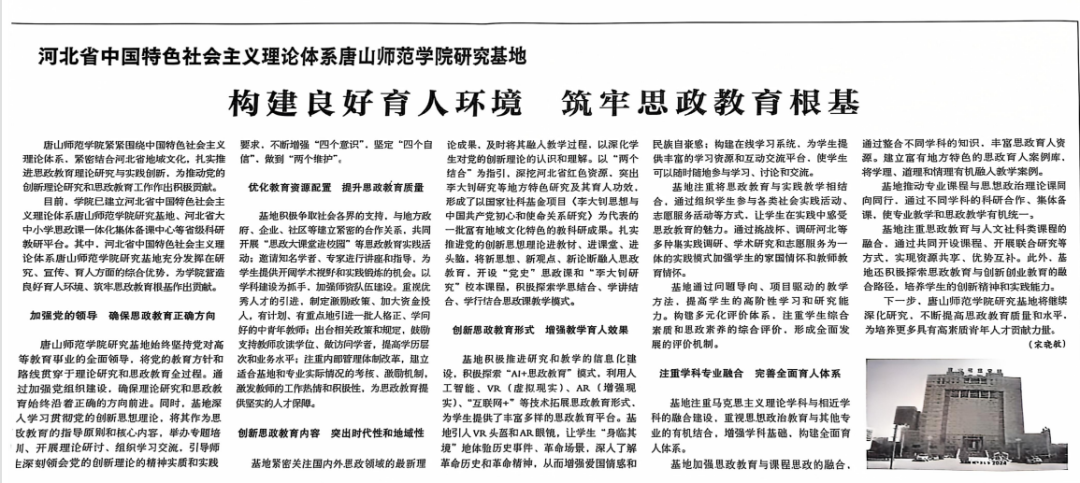 4.注重開發富有地方和學校特色的教學案例,開展了中學教學案例庫建設。通過河北省大中小學思政課一體化集體備課中心,聯合唐山市大中小學,構建技術賦能、生動活潑、地域文化特色鮮明、師生共同參與的思政課教學案例庫。已經初步形成李大釗精神、抗震精神、習近平總書記在河北重大實踐和視察河北重要講話指示等教學案例,運用到大中小學思政課建設中,成效顯著。編寫《李大釗與新中國》等系列唐山本土紅色文化校本教材和教學案例庫,圍繞大中小學思政課一體化建設、紅色文化育人等開展教學研究,獲批國家社科基金項目2項,教育部產學研合作項目2項,河北省高校教育教學改革研究項目6項,出版學術專著10部,出版教材3部,發表學術論文數十篇?!皹嫿己糜谁h境 筑牢思政教育根基”思政課建設經驗在《光明日報》刊登宣介。