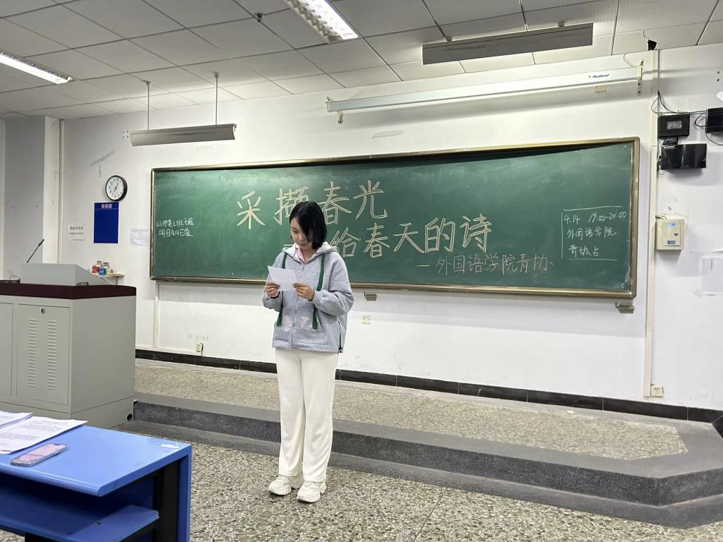詩歌創作圍繞春天校園為主題?;顒舆^程中,同學們運用英語、日語、德語、法語等多種外語進行詩歌創作,輪流上臺分享自己的作品,展現對春天的熱愛和贊美,記錄在學校里發生的故事,傳遞積極向上的正能量,展示語言的魅力,傳遞積極向上的價值追求。