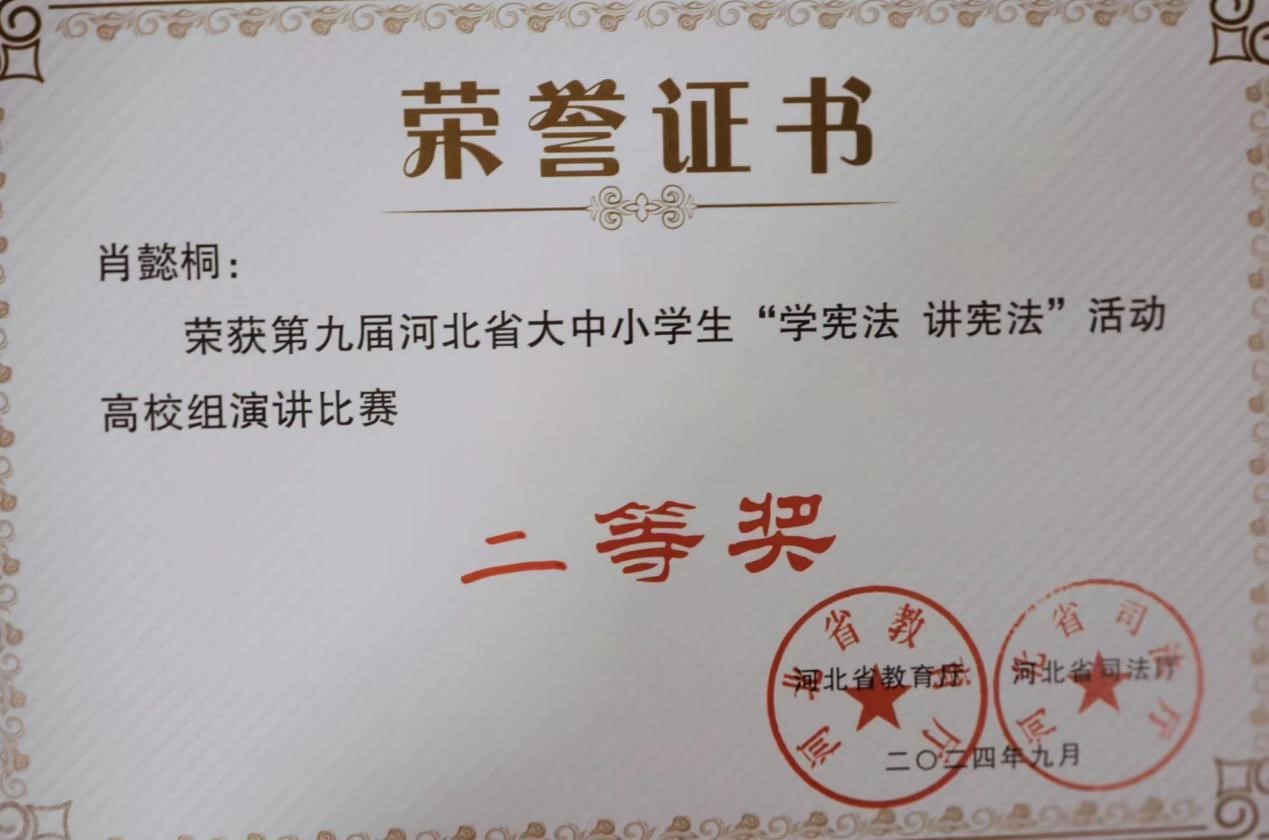 9月26日,由河北省教育廳、河北省司法廳主辦,河北師范大學(xué)承辦的第九屆河北省大中小學(xué)生“學(xué)憲法 講憲法”大賽暨全國選拔賽在石家莊成功舉行。我校歷史文化與法學(xué)系2023級法學(xué)專業(yè)王鑫璐同學(xué)在高校組素養(yǎng)競賽中榮獲二等獎,2024級法學(xué)專業(yè)肖懿桐同學(xué)在高校組演講比賽中榮獲二等獎。