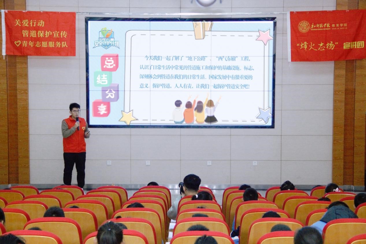 簽約儀式后,教育學(xué)院烽火志揚(yáng)宣講團(tuán)為西山路小學(xué)學(xué)生帶來了精彩的宣講。宣講團(tuán)成員根據(jù)學(xué)生認(rèn)知特點(diǎn)精心設(shè)計(jì)宣講內(nèi)容,以趣味謎語(yǔ)、實(shí)驗(yàn)等方式引出油氣管道主題,借助模型和圖片講解西氣東輸工程、管道建設(shè)維護(hù)知識(shí)和安全防護(hù)及應(yīng)急逃生方法,讓孩子們認(rèn)識(shí)“能源動(dòng)脈”,激發(fā)其擔(dān)當(dāng)“管道安全小衛(wèi)士”的熱情,增強(qiáng)其環(huán)保與社會(huì)責(zé)任感,樹立正確能源保護(hù)觀念。