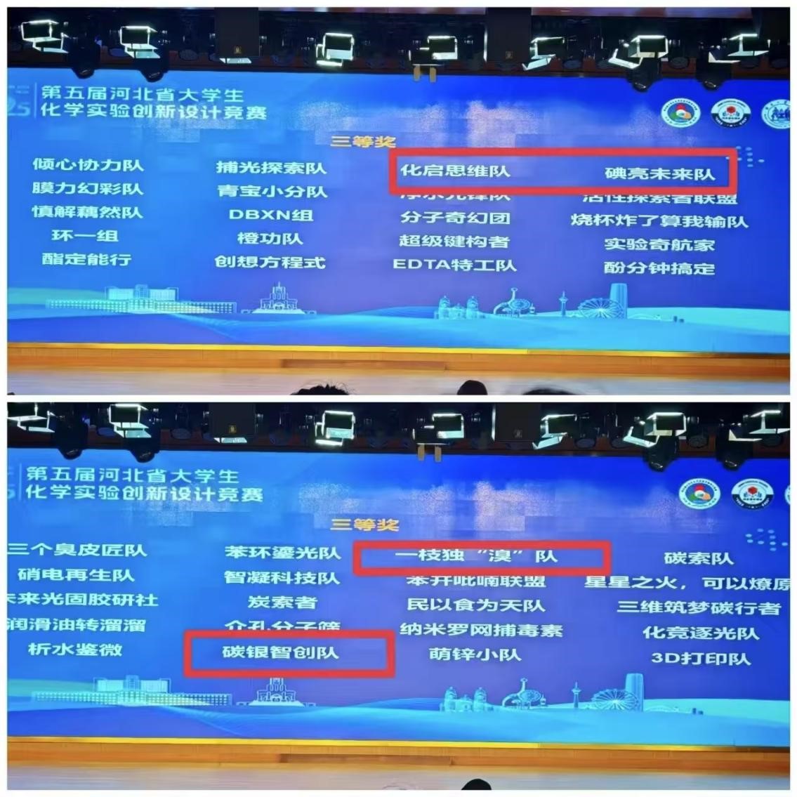 在這場高手云集的競賽中,化學系積極響應,郭小松老師肩負重任,精心組織并帶領4支隊伍踏上了競賽征程。比賽現場,化學系學子們精神抖擻,飽滿熱情地投入到各個環節中。在實驗操作環節,他們展現了嚴謹的科學態度,每個操作步驟都嚴格遵循規范,精確把控實驗條件,不放過任何一個細節;在創新設計展示環節,出色的創新能力得以充分展現,隊員們提出的新穎實驗思路與設計方案讓人眼前一亮;在團隊協作過程中,協作精神得到了充分體現,隊員們各司其職、密切配合,共同攻克了一個又一個難題。經過激烈角逐,化學系學子憑借扎實的專業知識、創新的思維和默契的團隊協作,最終斬獲4項河北省三等獎。