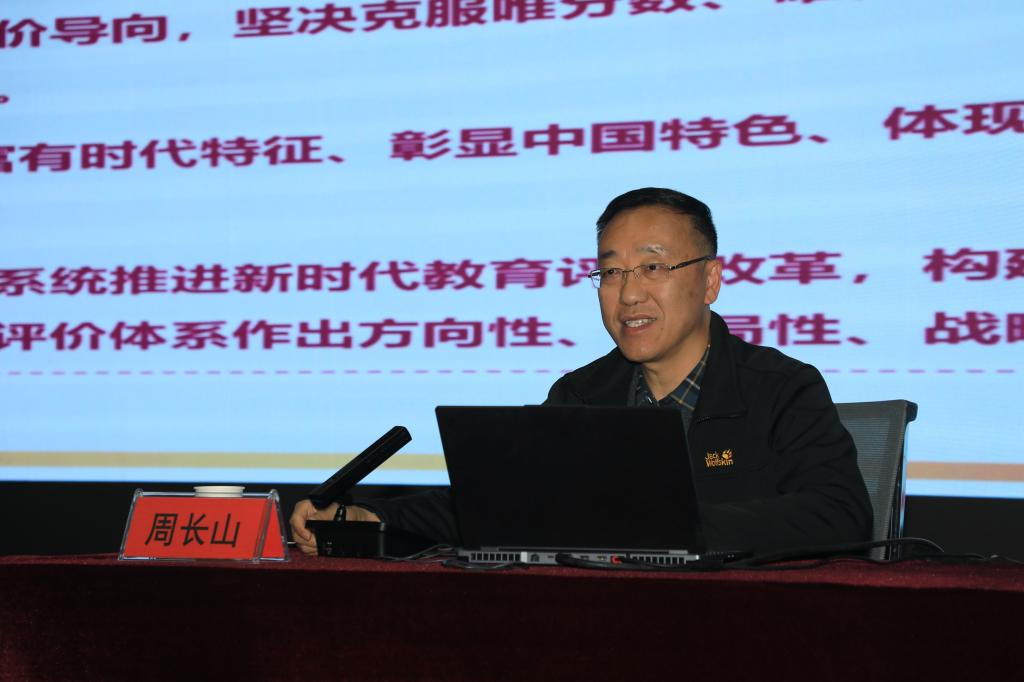 培訓主題為“以評定向,以評促強,扎實做好學校評建工作”,周教授以深化教育評價改革為切入點介紹了審核評估的背景,結合大量實踐案例從自評自建動員、自評整改和迎接評估等方面對審核評估中的關鍵性指標要求、實施要點及指標內涵以及“新”在何處進行了全面深入的解讀。新一輪審核評估具有六個突出特點,立德樹人導向明確、聚焦教學改革、分類評估、立體多維綜合評價、線上入校的方式創新、持續整改。他強調,教育教學審核評估涵蓋了學校工作的各個方面,是對學校工作的全面體檢,學校各部門、全校師生員工都是審核評估的參與者,各部門統一思想,加強溝通協作,才能確保審核評估工作高質量推進和完成。