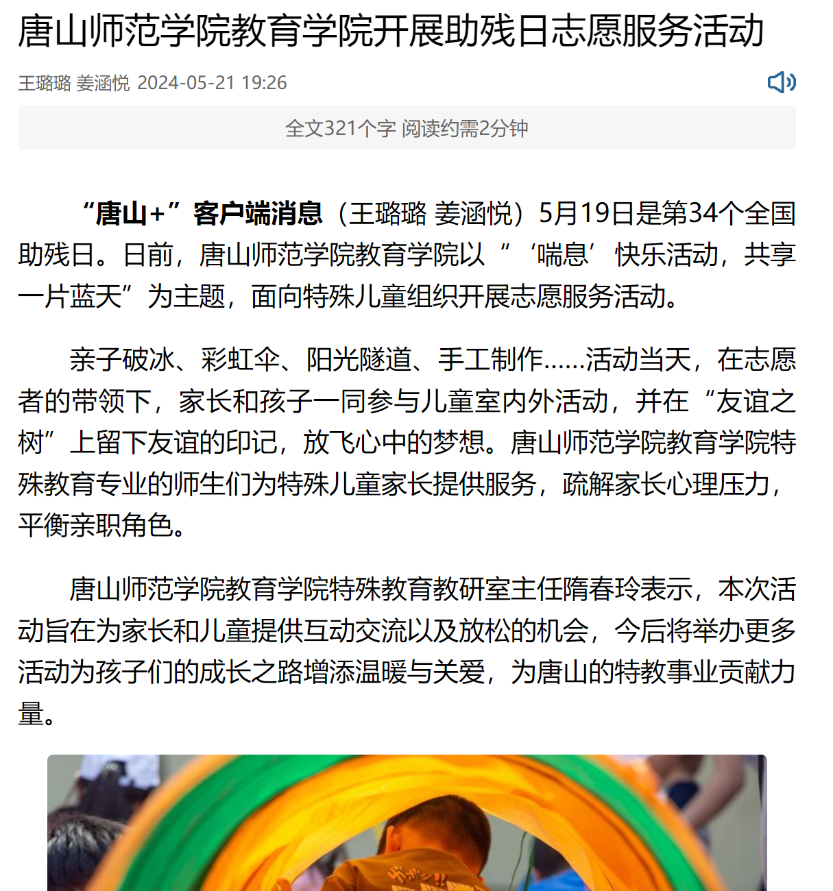 5月19日是第34個(gè)全國(guó)助殘日。日前,唐山師范學(xué)院教育學(xué)院以“‘喘息’快樂(lè)活動(dòng),共享一片藍(lán)天”為主題面向特殊兒童組織開(kāi)展志愿服務(wù)活動(dòng)。