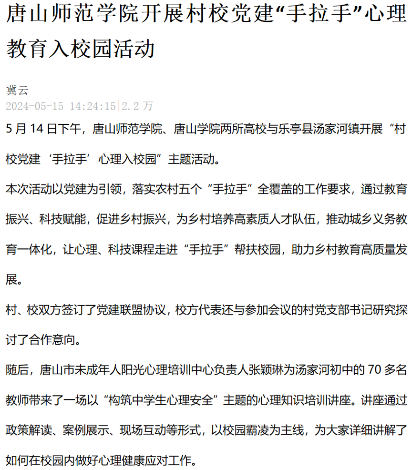 5月14日下午,唐山師范學院、唐山學院兩所高校與樂亭縣湯家河鎮開展“村校黨建‘手拉手’心理入校園”主題活動。