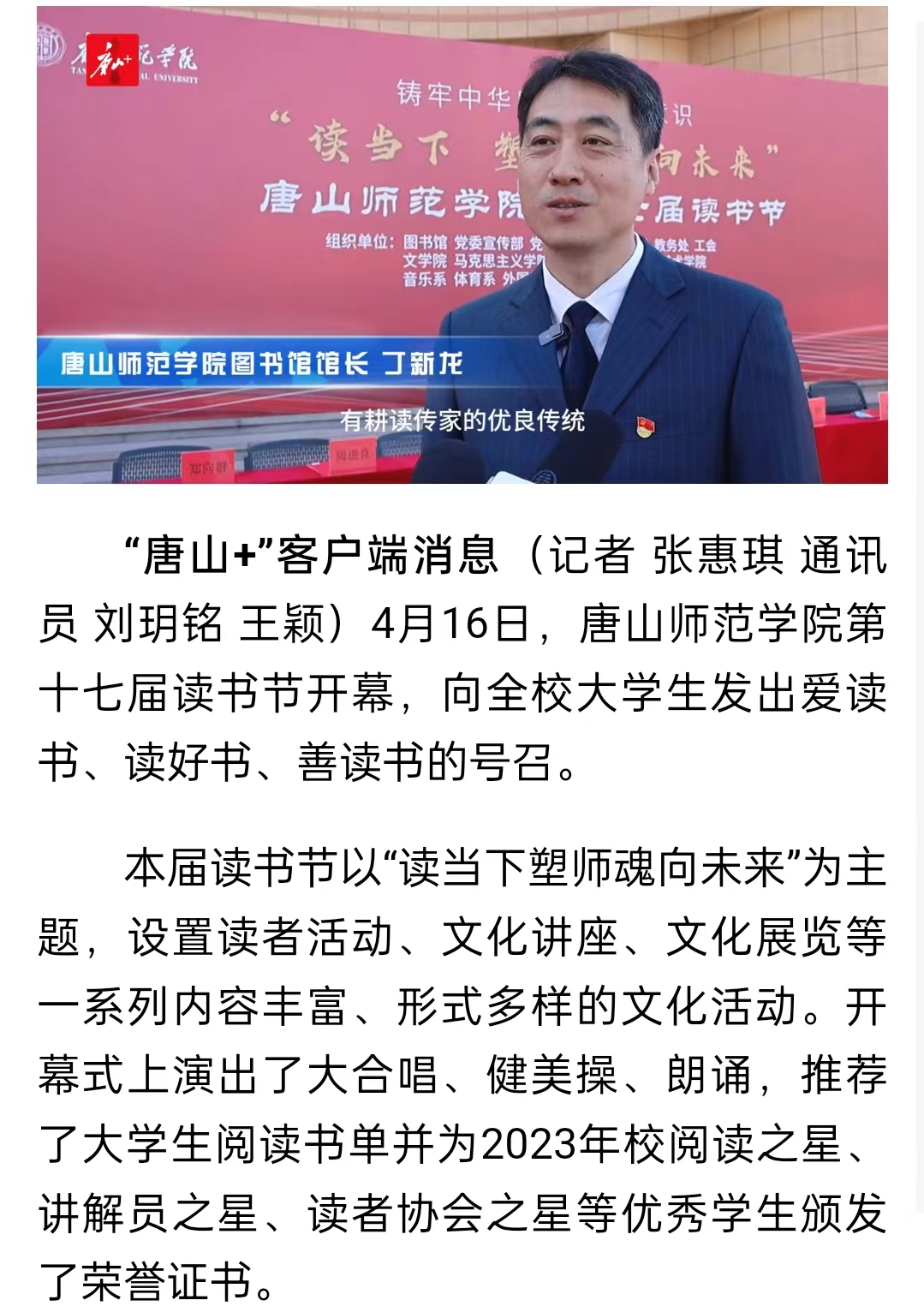 4月16日,唐山師范學院第十七屆讀書節開幕,向全校大學生發出愛讀書、讀好書、善讀書的號召。