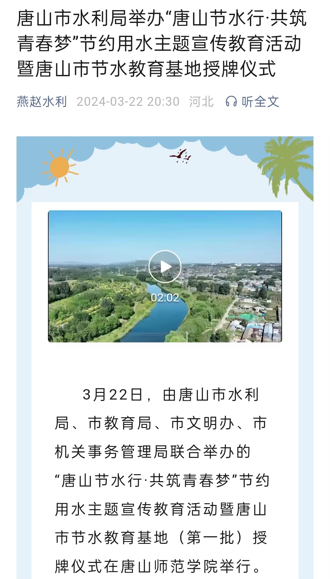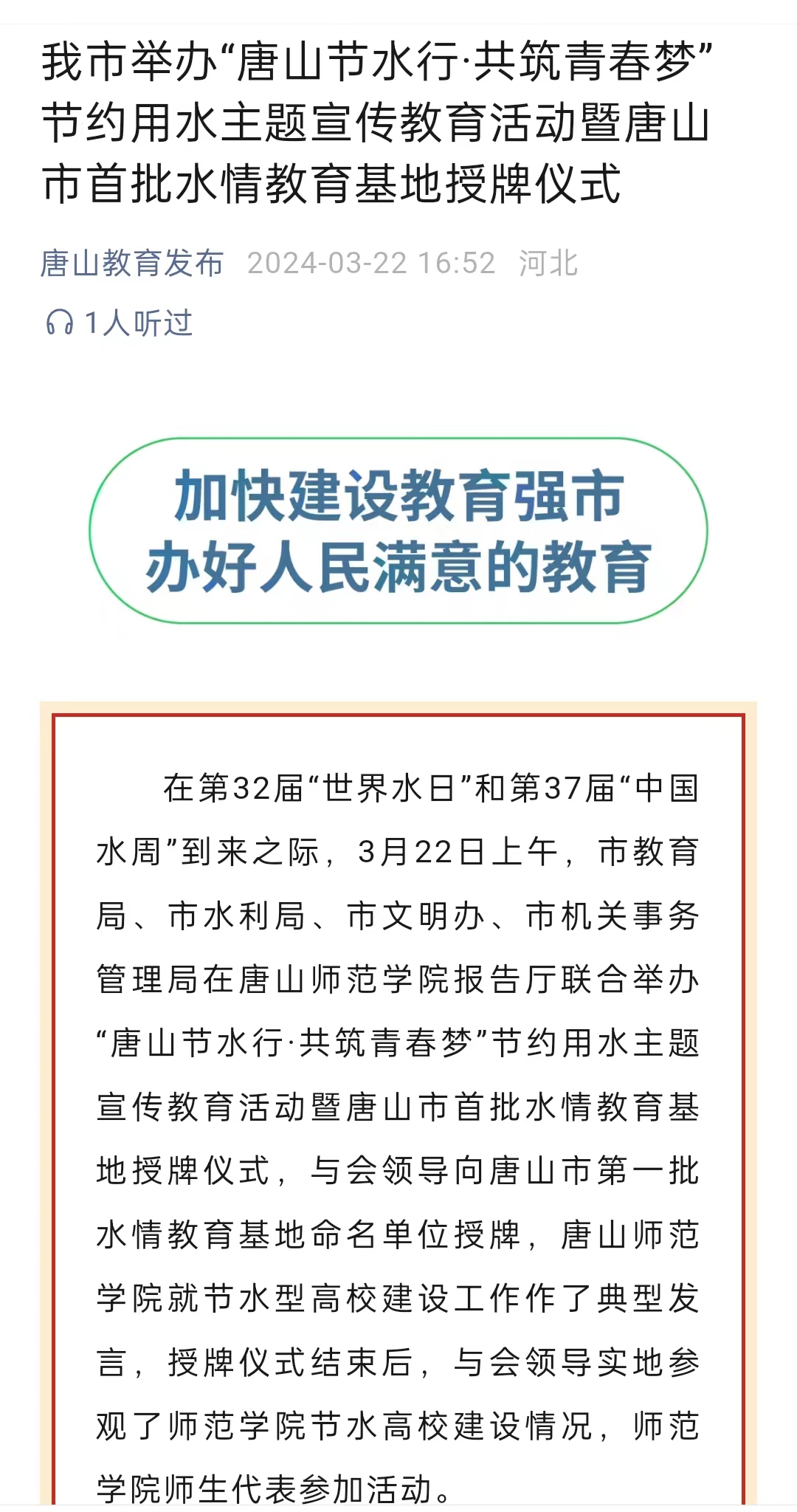 3月22日,由唐山市水利局、市教育局、市文明辦、市機關事務管理局聯合舉辦的“唐山節水行·共筑青春夢”節約用水主題宣傳教育活動暨唐山市節水教育基地(第一批)授牌儀式在唐山師范學院舉行。唐山師范學院就節水型高校建設工作作了典型發言,授牌儀式結束后,與會領導實地參觀了師范學院節水高校建設情況,師范學院師生代表參加活動。