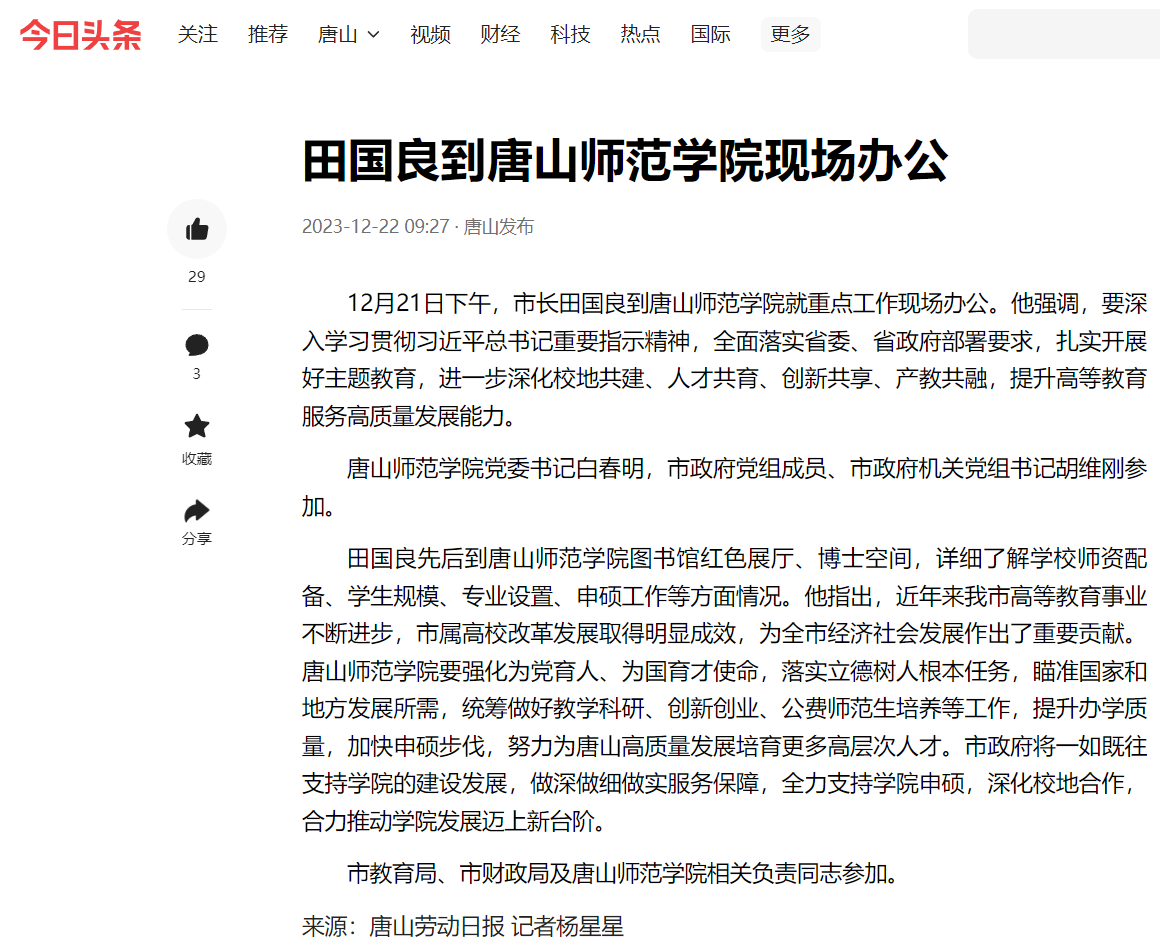 12月21日下午,市長田國良到唐山師范學院就重點工作現場辦公。他強調,要深入學習貫徹習近平總書記重要指示精神,全面落實省委、省政府部署要求,扎實開展好主題教育,進一步深化校地共建、人才共育、創新共享、產教共融,提升高等教育服務高質量發展能力。