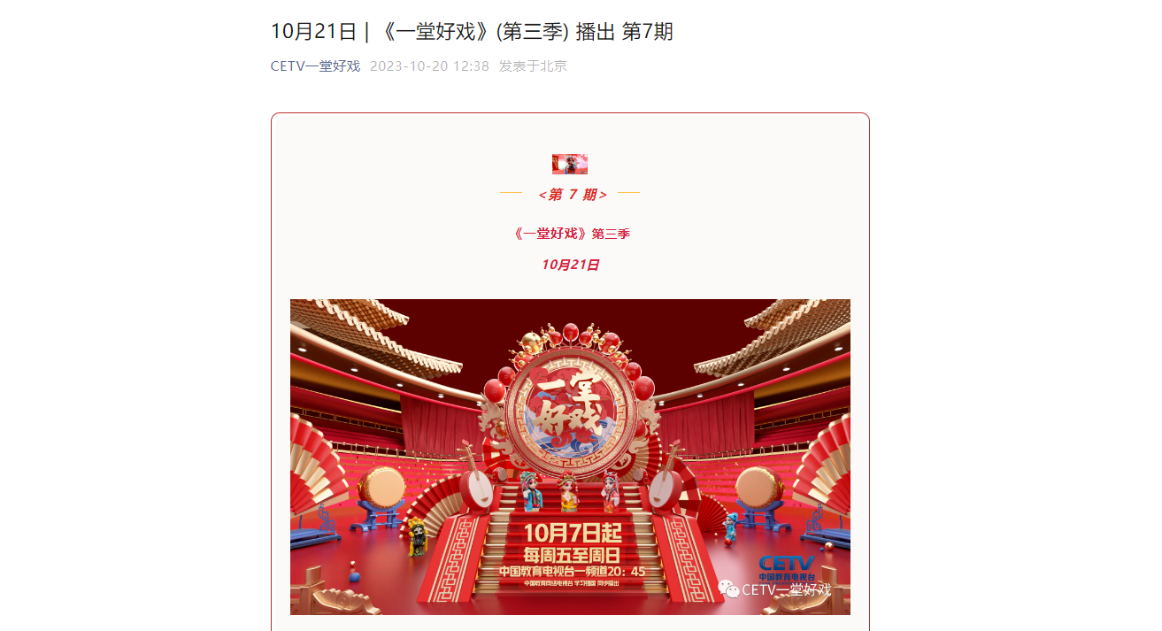 《一堂好戲》(第三季)錄制的十二期原創課本劇格調高雅、主旨鮮明、教育意義突出。孩子們在學演過程中,不僅收獲了唱念做打的技藝,更在內心深處播撒了熱愛傳統文化的種子,深化了對家國情懷的認知。孩子們的“童子功”和藝術表現力,將為廣大電視觀眾帶來全新的視覺沖擊和不凡的藝術感悟。我校評劇課本劇《鐵肩少年》節目于10月21日20:45在CETV-1《一出好戲》播出。